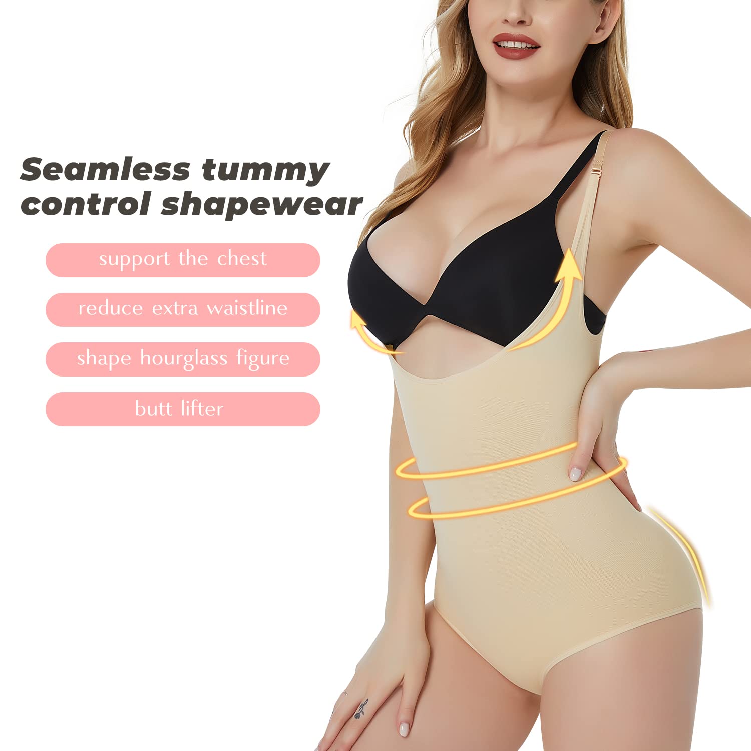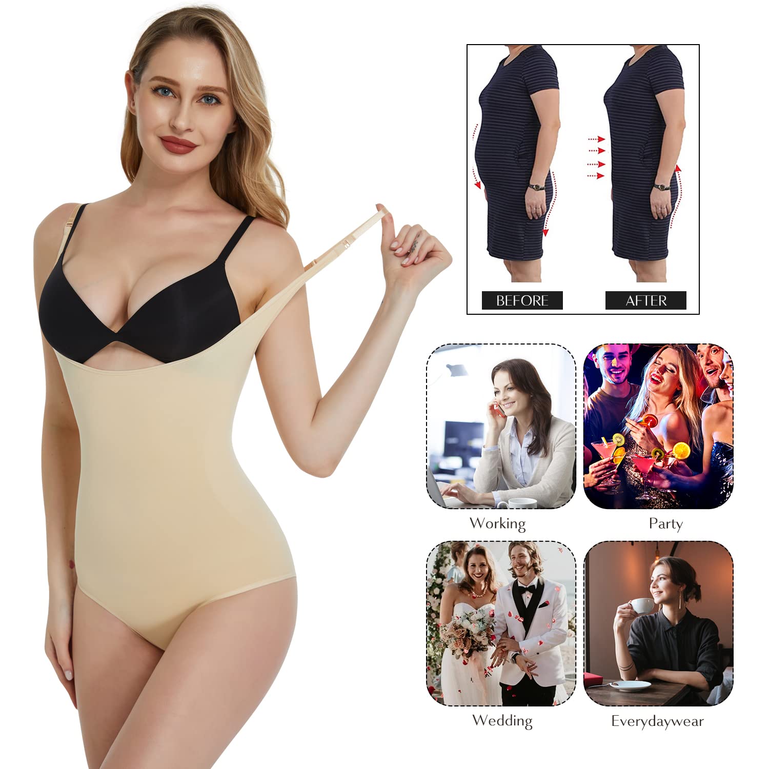 【U-shape Open Bust Design】 Allows you to wear your own favorite bra and special front U-type design makes your breast more erect and attractive.This women bodysuit emphasize your natural hourglass curve, no squeezing feeling but like a comfortable hug touch skin. Tummy control bodysuit for women is great to be worn after pregnancy recovery.
